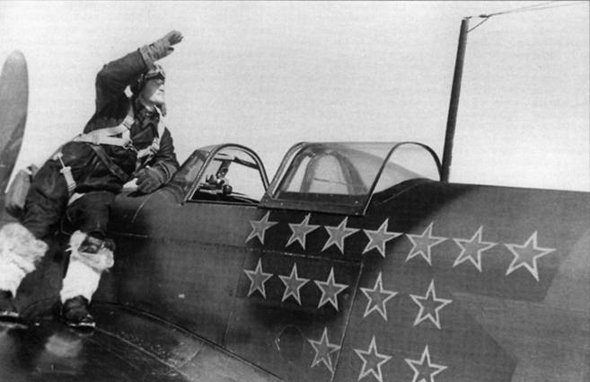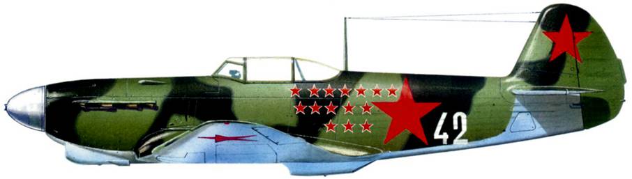 В 910 ИАП Н А Козлов, предположительно, с осени 1942 г, летал на самолете Як-1б бортовой № 42. Камуфляж — один из стандартны» для Як-1 черный и зеленый сверху, светло-голубой снизу. Бортовой номер белого цвета, нестандартного, но характерного для данной авиачасти написания Белый цвет кока винта — отличительный признак 910 полка Лопасти — с тремя желтыми полосами на средней части каждой из них Опознавательные знаки — в шести позициях (фюзеляж, киль, низ крыла), без окантовки После завершения Сталинградской битвы, весной 1943 г, на левом борту истребителя были нанесены звездочки одержанных летчиком побед Впоследствии они рисовались справа от опознавательного знака (звезды) на фюзеляже Кроме того, после Курской битвы на носовой части самолетов полка нарисовали гвардейские знаки В 907 ИАП за командиром полка Н А Козловым был закреплен самолет Ла-5ФН № 21 Наносить на борт самолета звезды побед в полку не было принято, равно как и рисовать другие знаки, демонстрирующие заслуги летчика. Делалось это. чтобы не привлекать в бою внимание противника к тому или иному самолету В 1945 году, когда полк получил истребители Ла-7, за командиром полка Н А Козловым был закреплен самолет с бортовым номером 13 Имея предубеждение к этой цифре, возросшее после печальной судьбы своего первого Яка. Н. А. Козлов попросил этот номер закрасить и нанести новый (аэродром Вормсфельде, 1945 г.)