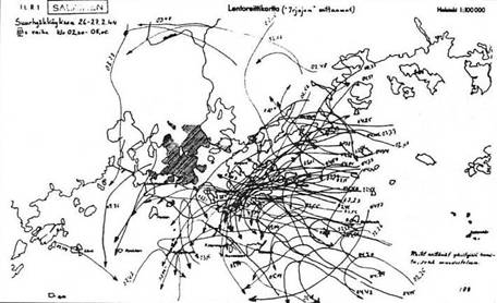 Маршруты выхода на цель бомбардировщиков в третьем налете, отмеченные финскими постами ВНОС
