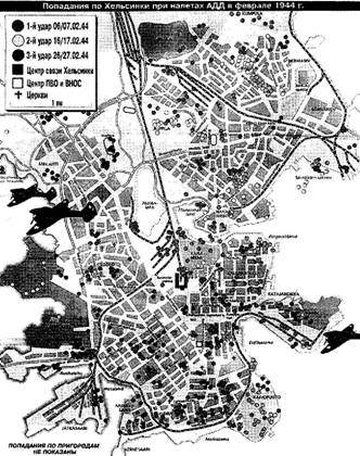 Уточнение результатов авиационных ударов по финской столице с использованием самолетов-разведчиков, прежде всего из состава ВВС КБФ, велась непрерывно. Но наиболее интересные сообщения были получены по линии агентурной разведки. 26 февраля 1944 г. исполнявший должностные обязанности начальника разведотдела штаба КБФ капитан 3 ранга Добрускин со ссылкой на свои источники в Хельсинки сообщил в штаб АДД, что в результате авианалетов сильно пострадало здание железнодорожной станции Хельсинки. [23*] Много бомб попало в станционные пути. В центре города и в районе Фело повреждено около сотни каменных зданий и военные казармы. В большинстве городских зданий были выбиты окна.