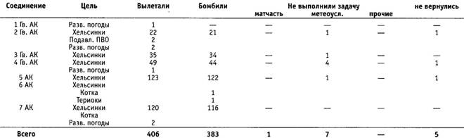 Несмотря на долгие приготовления, затруднявшие сохранение в секрете намерений советского командования, первый налет все- таки оказался неожиданным для населения финской столицы. В ночь на 7 февраля было нанесено два массированных удара. Чтобы дезорганизовать ПВО противника, советское командование выделило пять экипажей из состава 2-го Гв. АК для подавления зенитных точек и прожекторов. По советским данным, из 785 вылетевших самолетов 728 сбросили непосредственно на Хельсинки 6443 бомбы общей массой 910 т. Крупнокалиберные бомбы (всего сброшено 12 бомб массой 1000 кг и более) разорвались в районе железнодорожных мастерских, войсковых казарм, кабельного завода. Экипажи наблюдали свыше 30 крупных пожаров. С воздуха наблюдался огонь большой площади в южной части города; по докладам экипажей, в Хельсинки горели газохранилище, строительные склады, войсковые казармы, а также электромеханический завод "Стрельберг" (см. таблицы 2 и 3).