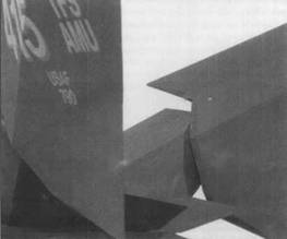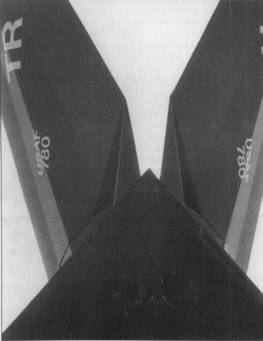 Два сливных отверстия топливной системы находятся на нижней поверхности в хвостовой части фюзеляжа. На снимке – первый YF-117А (79-10780), ныне выставленный перед въездом па авиабазу Неллис, шт. Невада. Хорошо видна форма и развал килей. В отличие от «Хэв Блю» у F-117А кили «развалены» наружу.