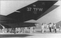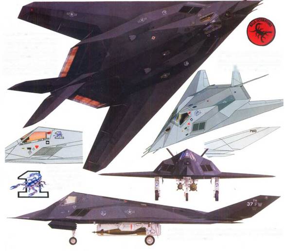 Пара F-117А из 37-го тактического истребительного авиакрыла наносят удар но целям в Багдаде, ночь на 16 января 1991 г. Крылом командовал полковник Уитли, вступивший в должность всего за несколько дней до переброски самолетов из США на театр военных действий. Здесь же показаны вид сверху, сбоку и спереди одного из самолетов 37-го TR.