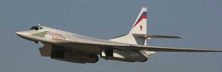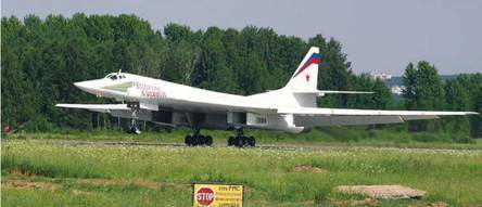 Слева: первый модернизированный Ту-160 с бортовым №19 совершает свою первую посадку на авиабазе Энгельс, 5 июля 2006 г.