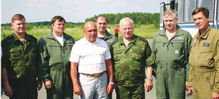 Вверху: после сдаточного полета первого модернизированного Ту-160 на аэродроме КАПО, 26 июня 2006 г. (слева направо): командующий 37 ВА генерал-лейтенант Игорь Хворов, командир экипажа ведущий летчик-испытатель Александр Журавлев, генеральный директор КАПО Наиль Хайрулин, второй пилот – начальник летной службы ОАО «Туполев» Виктор Минашкин, Главнокомандующий ВВС России генерал армии Владимир Михайлов, штурман- навигатор-испытатель Евгений Кудрявцев, штурман-оператор-испытатель Игорь Никулин
