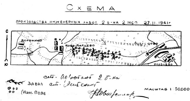 «Спецрота Потапова была дислоцирована в центре производимых работ, т. е. в с. Ольгово. Утром 27.11.41 г. работы по минированию шоссе от Ольгово до Астрецово продолжались в основном силами 244-го стройбата.