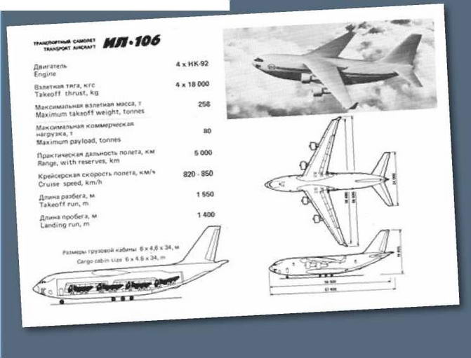 Первая публичная информация о разработке «Ильюшиным» перспективного тяжелого оперативно-стратегического военно-транспортного самолета Ил-106 грузоподъемностью 80 т появилась четверть века назад, когда на авиационных выставках начала 90-х можно было увидеть модель такой машины и рекламную листовку с основными проектными данными.