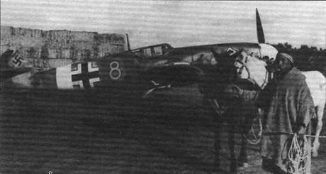 Сразу же по возвращении в Тунис угодили в жуткую переделку. Аэродром Джедайда, который I группа занимала совместно с III и «штуками» из ll/StG 3, жил почти тыловой жизнью, и почему-то не был своевременно оповещен о прорыве немецкого фронта частями 1-й британской Армии при поддержке американских танков. Их бросок был стремительным; Юр- ген Хардер (Hptm. J. Harder), бывший в то время командиром III/JG 53, рассказывал: "Мы находились на довольно удаленном полевом аэродроме, и тут. совершенно неожиданно, – танковая атака! Примерно в 16:30 танки обнаружили всего в восьмистах метрах от нас. Я бросился к своей машине, взлетел, и едва набрал 200 метров, как первый танк ворвался на летное поле".