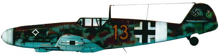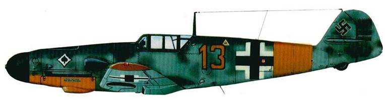Этот самолет, полученный Криниусом 15 июля 1942 года, принадлежал к первой партии поступивших на восточный фронт новых «Мессершмиттов» серии G- 2. Выпущен заводом фирмы WNF в мае-ию>ю 1942-го Вместе с другими 26 сентября 1942 года он был передан в JG 3. Самолет имеет типовую заводскую окраску по стандартной схеме: верх – темно-серый RLM 74 и серый RLM 75. низ и борта фюзеляжа серо-голубой RLM 76. кок винта черно-зеленый RLM 70. Согласно принятому в I/JG 53 порядку, желтой краской RLM 04 были нанесены элементы быстрого распознавания: нижний капот двигателя, законцовки крыла снизу и широкая полоса на фюзеляже между шпангоутами 6 и 8 Опознавательные знаки и технические надписи стандартные. На руле направления четыре ряда по десять черных «абшюссбалкен» с красными звездочками сверху.