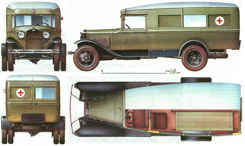 В 1938 г. Европа вовсю готовилась к предстоящей мировой войне. Гонка вооружений шла полным ходом, но вместе с тем думали и о спасении будущих раненых. К тому времени на ГАЗе завершили отработку конструкции санитарного автомобиля и запустили в массовое производство новый двигатель ГАЗ-М мощностью 50 л.с. Этот мотор устанавливали на все серийные машины Горьковского автозавода, в том числе и на фронтовую «неотложку», обозначенную ГАЗ-55, главным конструктором которой был Ю. Н. Сорочкин. В ее салоне можно было перевозить либо четырех лежачих на носилках и двух сидевших на откидных сидениях, либо двоих на подвешенных носилках и пятерых на откидных сидениях. В санитарном отделении установили калорифер для обогрева и смонтировали систему вентиляции, сделали элегантными крылья передних и задних колес. Отметим, что Московский автозавод имени Сталина (ЗИС) тоже выпускал санитарные машины. Однако он сделал их гораздо меньше. Сначала «скорые» изготавливали на шасси правительственного автомобиля ЗИС-101 («ТМ», № 11 за 1997 г.), а затем — на основе автобуса ЗИС-16 (см. предыдущий номер). В последнем располагалось 10 носилок для лежачих раненых и 10 сидений.