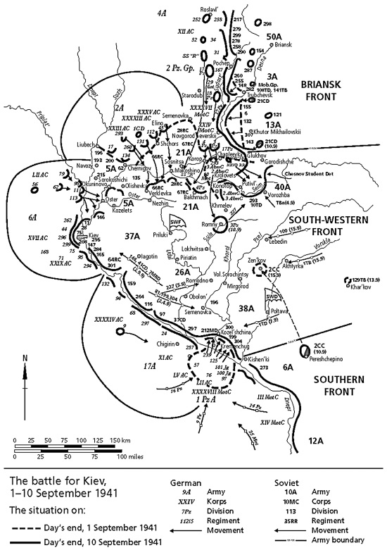 На юге 1-я танковая группа фон Клейста выскочила с плацдарма у Кременчуга, две бронированные лавины покатились навстречу друг другу. Создалась смертельная угроза Южному и Юго-Западному фронтам, и 4 сентября маршал Буденный спешно запросил подкрепления. 7 сентября авангард Гудериана занял Конотоп и пошел на Ромны. Положение советских войск в районе Киева стало безнадежным, так как они физически не успевали выйти из формирующегося котла. Однако не было попыток ни отвести войска, ни помешать немцам замкнуть кольцо.