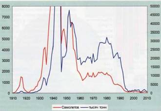 Количество самолетов показано красной линией, суммарная масса их конструкции – синей. На вертикальной оси слева отложено количество самолетов, построенных за год, на оси справа – суммарная масса их конструкции в тоннах.