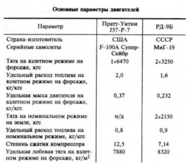 Сравнивая американский двигатель J57-P-7, установленный на истребителе F-100, с нашим РД-9Б, можно сказать, что американцы раньше перешли на двух-вальный компрессор, благодаря чему им удалось достигнуть высокой степени сжатия (12,5) и получить низкий удельный расход топлива на номинальном режиме (0,8), но двигатель получился очень тяжелым, его удельная масса на 60% выше, чем у РД-9Б. Конструктивным достижением J57-P-7 следует считать турбину, рабочие лопатки которой выполнены с полками.