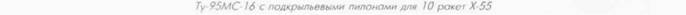 Предусмотренная возможность оснащения самолета подкрыльевыми подвесками привела к выпуску двух вариантов: Ту-95МС-6, несшего шесть Х-55 в грузоотсеке на многопозиционной катапультной установке МКУ-6-5 и Ту-95МС-16, дополнительно вооруженного еще десятью ракетами - по две на внутренних подкрыльевых катапультных установках АКУ-2 у фюзеляжа и по три - на внешних установках АКУ-3, размещенных между двигателями. Катапультирование ракет, выбрасывавшее их на достаточное расстояние от самолета и возмущенного воздушного потока вокруг него, осуществлялось пневматическим толкателем, их обратная уборка - гидравликой. После пуска барабан МКУ проворачивался, подавая в стартовое положение следующую ракету.