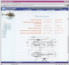 В разделе, скромно озаглавленном «Products», можно ознакомиться с тактико-техническими данными всех существующих вариантов вертолетов, изучить их проекции с габаритными и прочими размерами. Так как Eurocopter включает в себя и разработчиков, и производителей. то сервисное обеспечение эксплуатантов на сервере представлено весьма богато. Здесь находятся разделы «Обучение», «Ремонт и эксплуатация», «Техническая документация», «Техническая консультация» и др. Намного удобнее и быстрее получать советы специалистов по электронной почте, во всяком случае, клиенты Eurocopter поступают именно так.