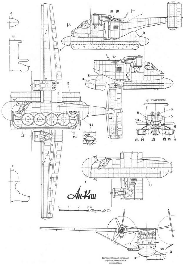 Поэтому, когда в 1971 г. в ОКБ О.К.Антонова приступили к проектированию ШВП для самолета Ан-14 (получившего обозначение Ан-14Ш), сразу же пошли по пути уменьшения давления на выходе воздуха из-под ГО. Ограждение состояло из надувного тороидального баллона со специальными внутренними торами (4 пары) вокруг точек, через которые подавался воздух. Конструкция позволяла автоматически создавать восстанавливающий момент при кренении самолета. Благодаря расположению расходных точек на значительном расстоянии от края ГО, наличию нескольких рядов износостойких протекторов, образовывавших лабиринтное уплотнение, создавалось значительное сопротивление истекающему воздуху. В результате он на выходе имел энергию, меньшую по сравнению с предыдущими схемами ГО. Так, на Ан-14Ш давление в районе крайнего протектора было в два раза ниже расчетного подушечного, тогда как у ХС-8А - примерно в 2 раза выше. ГО с общей площадью, равной площади крыла Ан-14. могло убираться в специальный контейнер, что уменьшало сопротивление ШВП в полете. Такая схема ГО была отработана на двух самоходных моделях весом 600 кг и на платформе с натурным ШВП, на которой проводились уборка и выпуск ГО. Воздух для подушки отбирался от турбоагрегата ТА-6А-1, который установили внутри фюзеляжа Ан-14.