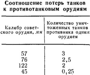 Из таблицы видно, что наша новая 57-мм пушка была хорошим истребителем фашистских танков в 1944 г.; 45-мм пушка устарела, не соответствовала новым требованиям, вела к излишним потерям и должна быть снята с вооружения.