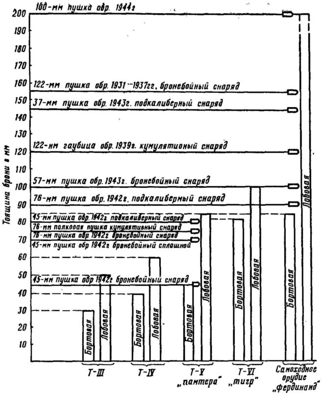 Рис. 9. Толщина брони основных типов немецких танков и броне-пробиваемость снарядов орудий советской артиллерии, состоящих на вооружении в 1943 г. (при угле встречи 90° и дальности стрельбы 600 м).
