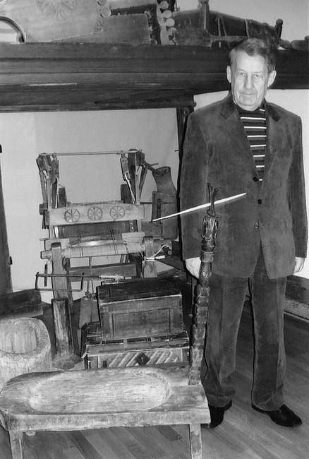 На переднем плане – устройство, которое освещало сельские избы в военное время: деревянное корыто с гнетком, в который вставлена лучина. Снимок 2009 года.