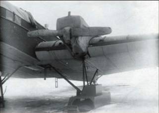 Ствол динаморективной пушки выступает вниз из фюзеляжа бомбардировщика ТБ-1
