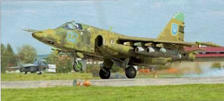 Главной "ударной силой" ВС Украины, таким образом, оказались штурмовики Су-25. По состоянию на март- апрель 2014 г. в составе 299-й БрТа на а. Кульбакино (Николаев) имелось всего 19 машин этого типа. Среди них 9 модернизированных Су-25М1, 1 модернизированный Су-25 УБМ-1 и 3 Су-25УБ (бортовые номера одноместных машин синие -01", "02", "03", "04", "05", -06", "07", -08", "10", "24", "25", "27", "38", -40", "41". Номера -спарок" – синие "60", "61", "62", "65"). Кроме того, еще один, снятый с хранения Су-25УБ (б/н желтый "07") находился по соседству, на Николаевском АРЗ. При этом часть перечисленных Су-25 была явно небоеспособна – по разным данным, не менее 5-6 одноместных Су-25 и 2 Су-25УБ находились к весне 2013 г. в ремонте или "предназначались для модернизации". Утверждалось, что модернизированные украинские Су-25М-1 и Су-25УБМ-1 (с установленными на них новыми приборами, прицелами и GPS) способны применять вооружение с высот до 5000 м и имеют "повышенную боевую живучесть", но последующие бои и потери подобного не подтвердили. Что же касается "высокоточного оружия", то хотя в 2011-2013 гг. неоднократно демонстрировались снимки Су-25 из 299-й БрТа с подвешенными ракетами Х-29, сделанные во время учений, данных о реальном боевом применении подобных ракет против ДНР и ЛНР не имеется. Наоборот, Су-25 "отличились", работая без особого разбора и точности обычными бомбами и НАР по жилым кварталам городов на Юго-Востоке Украины. Согласно имеющейся информации, на базе 299-й БрТа была создана "резервная авиационная штурмовая группа" из 8-10 Су-25, с мая 2014 г. приступившая к боевым вылетам с аэродромов Чугуев и Днепропетровск (в частности, в Днепропетровске в июне-июле 2014 г. было замечено 4 Су-25).