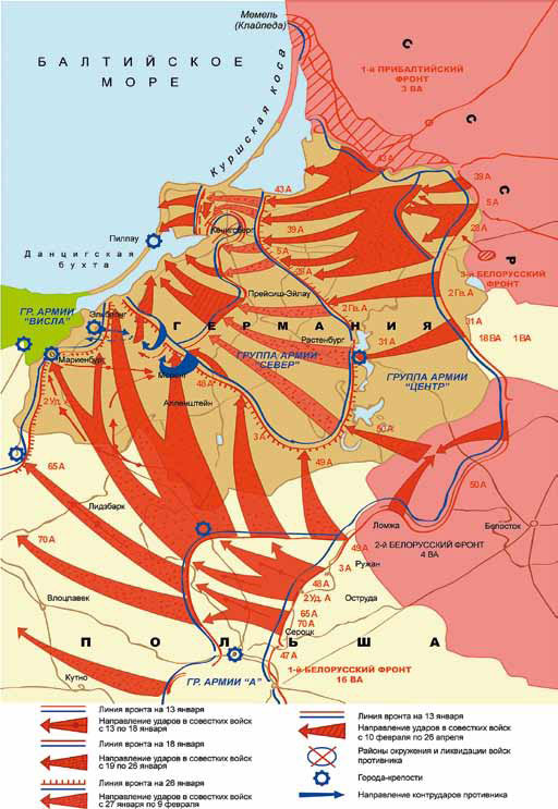 Перед войсками 3-го Белорусского фронта стояла задача разгромить Восточно-Прусскую группировку противника и взять Кенигсберг. «Вступив в командование фронтом, – вспоминал заместитель Василевского И. Х. Баграмян, – за считанные дни (Александр Михайлович) полностью изучил ситуацию, выявил те звенья оперативной цепи, ухватившись за которые можно было вытянуть ее полностью, то есть ликвидировать Восточно-Прусский плацдарм. Он с твердостью, присущей только очень волевым военачальникам, наметил последовательность действий. Сначала разгром Хейльсбергской группировки, затем штурм Кенигсберга, и наконец, сокрушение войск врага на Земландском полуострове. Поручив мне все, что было связано с подготовкой штурма Кенигсберга, он, казалось, весь ушел в организацию Хейльсбергской операции и руководил ею с необычайной конкретностью и скрупулезностью. Как только развязка в Хейльсберге стала зримой, Александр Михайлович переключился на Кенигсберг и в короткий срок завершил разгром Восточно-Прусской группировки противника».