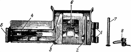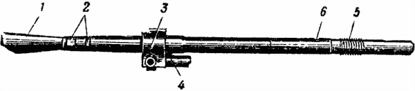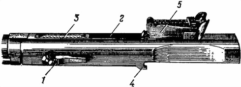 1 — замыкатель ствола; 2 — окно; 3 — щитик; 4 — крючки; 5 — прицел