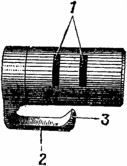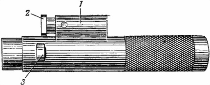 Газовая камора (рис. 14) имеет круговую выточку, в которую входит передний торец кожуха, чем предотвращается качка ствола; вертикальное отверстие для отвода пороховых газов; поперечное отверстие для помещения регулятора; патрубок, в который входит газовый поршень. На нижней плоскости газовой каморы сделаны три продольные прорези с цифрами 2, 1 и 3 для установки зуба фиксатора.