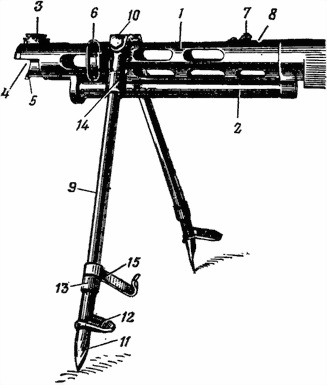 1 — верхняя труба; 2 — нижняя труба; 3 — прилив; 4 — вырез для газовой каморы; 5 — зуб для ограничения поворота ствола; 6 — антабка; 7 — упор для приемника; 8 — вырез для зацепа рукоятки; 9 — нога сошки; 10 — ось ноги сошки; 11 — сошник; 12 — башмак; 13 — кольцо; 14 — подвижная муфта с гнетком; 15 — застежка