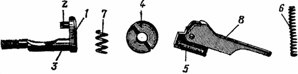 1 — головка; 2 — зуб; 3 — стержень; 4 — муфта; 5 — защелка; 6 — пружина защелки; 7 — пружина замыкателя; 8 — рукоятка защелки