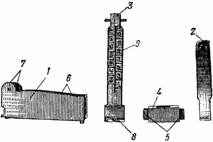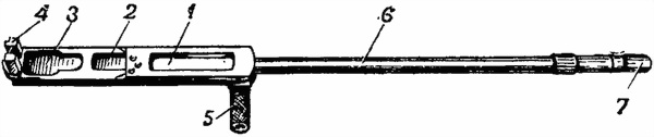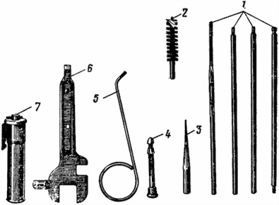 1 — шомпол; 2 — ершик; 3 — выколотка; 4 — извлекатель; 5 — коленчатый стержень; 6 — ключ-отвертка; 7 — масленка