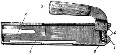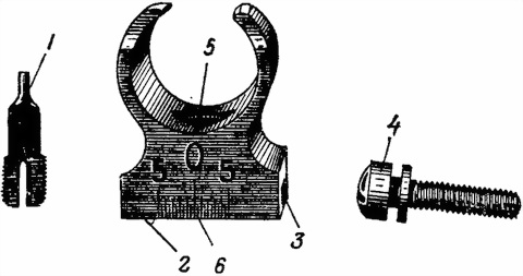 1 — мушка; 2 — предохранитель мушки; 3 — пазы; 4 — винт; 5 — отверстие для мушки; 6 — шкала с делениями