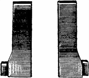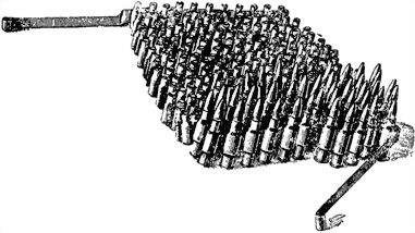 24. Лента (рис. 40) служит для помещения патронов. Лента состоит из звеньев, соединяемых с помощью соединительных пружин. Передняя часть звеньев ленты сделана по форме дульца гильзы патрона. К концам ленты прикреплены наконечники.