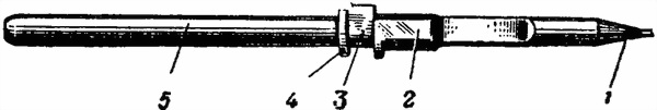 Замыкатель ствола (рис. 18) служит для закрепления ствола в ствольной коробке. Оп имеет головку с зубом, стержень с полукруглой выемкой для ствола и нарезкой для соединения с муфтой и защелку с рукояткой и пружиной, которая в сложенном виде препятствует утапливанию замыкателя. Заскакивание зуба головки замыкателя в выемку ствола обеспечивается пружиной замыкателя.