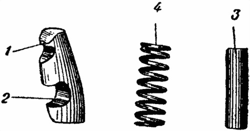1 — зацеп; 2 — вырез для оси; 3 — ось выбрасывателя; 4 — пружина выбрасывателя