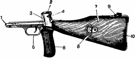 1 — закругленный выступ; 2 — стойка; 3 — вертикальный выступ; 4 — канал; 5 — спусковая скоба; 6 — пистолетная рукоятка; 7 — приклад; 8 — антабка; 9 — масленка; 10 — металлический затыльник