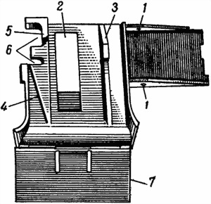 1 — отверстие для оси крышки; 2 — поперечное окно; 3 — направляющий выступ для пули; 4 — направляющий выступ для дна гильзы; 5 — ограничительный выступ; 6 — вырезы для зацепов движка; 7 — лоток