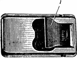 23. Коробка (рис. 39) служит для помещения ленты с патронами. Она состоит из корпуса и крышки. На корпусе имеется завертка, а на крышке — застежка и ручка для переноски коробки.