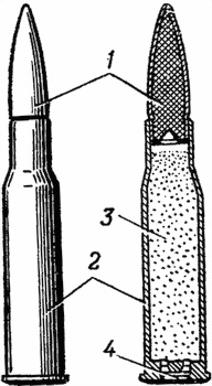 1 — пуля; 2 — гильза; 3 — пороховой заряд; 4 — капсюль