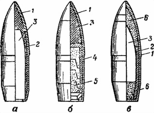 а — обыкновенная со стальным сердечником; б — трассирующая; в — бронебойно-зажигательная; 1 — оболочка; 2 — свинцовая рубашка; 3 — сердечник; 4 — стаканчик; 5 — трассирующий состав; 6 — зажигательный состав