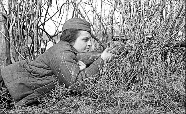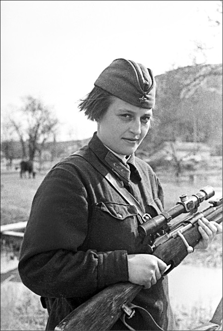 Людмила Павличенко на огневой позиции со снайперской винтовкой Мосина и оптическим прицелом «ПЕ». Севастополь, март 1942 г.