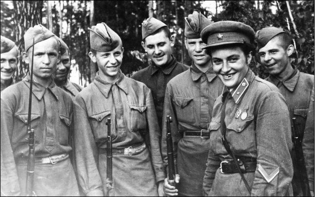 Младший лейтенант командир снайперского взвода Л.М. Павличенко со своими бойцами. 32-я гвардейская дивизия ВДВ, Московский военный округ. Август 1942 г. Из семейного архива Л.М. Павличенко