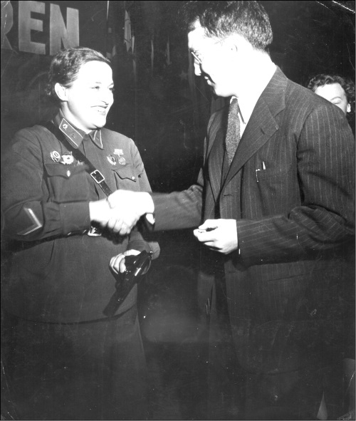 Президент Чикагской ассоциации метких стрелков Дж. Мак-Кормик вручает Л.М. Павличенко сувенир – пистолет «Кольт М1911». Октябрь 1942 г. Из семейного архива Л.М. Павличенко