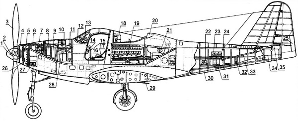 1 — кок винта; 2 — ствол 37-мм пушки; 3 — винт «Аэропроп»; 4 — пламегаситель пулемёта; 5 — 12,7-мм пулемёт; 6 — маслобак редуктора; 7 — кислородный баллон; 8 — патронный ящик пулемёта; 9 — гильзоотвод; 10 — магазин пушки; 11 — расширительный бачок тормозной системы; 12 — бронестекло; 13 — коллиматорный прицел; 14 — ручка управления; 15 — рычаг управления двигателем; 16 — штурвал управления триммером руля высоты; 17 — ручка управления триммером руля направления; 18 — приёмник SCR-695A; 19 — двигатель «Аллисон» V-1710-93; 20 — всасывающий патрубок нагнетателя; 21 — отверстие для забора воздуха в двигатель при работе на земле (по правому борту); 22 — блок модулятора BC-457A; 23 — приёмник BC-453B; 24 — входной изолятор антенны; 25 — триммер руля направления; 26 — редуктор; 27 — переднее такелажное отверстие; 28 — аккумулятор; 29 — заслонки радиаторов; 30 — тяга управления рулём высоты; 31 — передатчик BC-457A; 32 — заднее такелажное отверстие; 33 — цепь Галля для управления триммером руля направления; 34 — трос управления рулём направления; 35 — гибкий валик управления триммером руля направления.