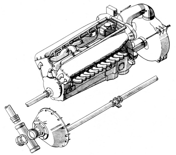 Мотор V-1710-109, трансмиссионный вал, редуктор и втулка воздушного винта. Обратите внимание на промежуточную муфту вала.