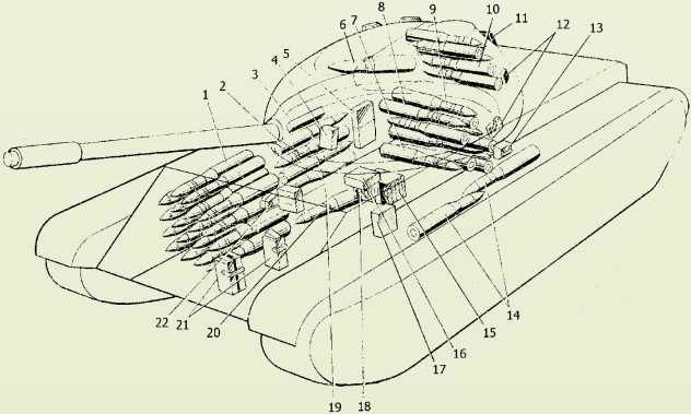 Размещение боекомплекта в танке Т-55 с КДТ-1: 1 — укладка на 18 выстрелов в двух баках-стеллажах; 2 — хомутиковая укладка на четыре выстрела; 3 — стеллаж для трех сумок с ручными гранатами Ф-1; 4 и 5 — магазин-коробки для спаренного пулемета; 6 — хомутиковая укладка на один выстрел; 7 — хомутиковая укладка на один выстрел; 8 — стеллажная укладка на 10 выстрелов; 9 — хомутиковая укладка на один выстрел; 10 — стеллажная укладка на пять выстрелов; 11 — коробки для зенитного пулемета; 12 — сумки с патронами для сигнального пистолета; 13 — стеллаж для двух сумок с ручными гранатами Ф-1; 14 — хомутиковая укладка на два выстрела; 15 — стеллаж на четыре коробки для спаренного пулемета; 16 и 17 — магазин-коробки для спаренного пулемета; 18 — стеллаж на одну магазин-коробку для спаренного пулемета; 19 — стеллаж на одну магазин-коробку для спаренного пулемета; 20 — хомутиковая укладка на один выстрел; 21 — магазин-коробка для курсового пулемета; 22 — две сумки с магазинами для автомата.