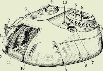 Башня танка Т-55 с КДТ-1: 1 — щель для спаренного пулемета; 2 — кронштейн установки осветителя Л-2Г; 3 — отверстие для установки прибора наблюдения заряжающего; 4 — крышка люка заряжающего; 5 — командирская башенка; 6 — бронировка антенного ввода; 7 — отверстие для установки ночного прицела; 8 — поручень; 9 — крюк; 10 — щель для дневного прицела; 11 — кронштейн пушки; 12 — защитная планка; 13 — отверстие для установки прибора наблюдения наводчика.