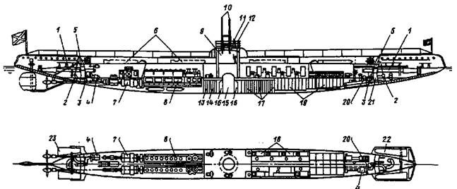 1 – трубчатый торпедный аппарат; 2 – носовой подводный якорь; 3 – заместительные цистерны подводного якоря: 4 – центробежная помпа; 5 – дифферентная цистерна; 6 – аппараты системы Джеаецкого: 7 – главные гребные электродвигатели; 3 – главные дизели; 9 – боевая рубка; 10 – перископы; 11 -штурвал вертикальных рулей; 12 – нактоуз съемного компаса; 13-17 – масляная, заместительная, уравнительная, “отрывная" и нефтяная цистерны; 18 – офицерские каюты; 19 – элементы аккумуляторной батареи; 20 – компрессор; 21 – цистерна пресной воды; 22, 23 – носовые и кормовые горизонтальные рули