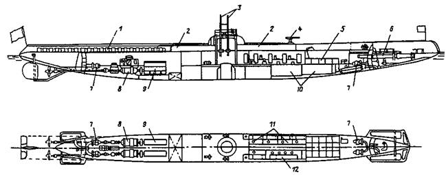 1 – мины типа “П/1"; 2 – палубные цистерны главного балласта; 3 – перископы; 4 – 57-мм орудие; 5 – рундуки команды; б – трубчатый торпедный аппарат; 7 – центробежная помпа; 8 – главный гребной электродвигатель; 9 – главный дизель мощностью 420 л.с; 10 – аккумуляторная батарея; 11 – офицерские каюты; 12 – кают-компания