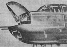Установка такого мощного вооружения потребовала изменения конструкции передней части фюзеляжа и ликвидации кабины штурмана. Для удобства обслуживания оружия на земле верхняя часть носа фюзеляжа может быть откинута, открывая подход к пулеметам, патронным ящикам и к передней части пушки (рис. 3).
