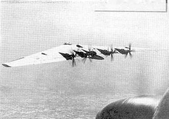 Итак, стало ясно, что истребитель – «летающее крыло» с умеренной стреловидностью – машина норовистая и неперспективная. А вот тяжелый бомбардировщик… В сентябре 1941 года фирма «Нортроп» начала проектировать гигантский самолет – «летающее крыло» с четырьмя звездообразными двигателями воздушного охлаждения «Пратт-Уитни» R-4360-17 мощностью по 3000 л.с., рассчитанный на доставку 10 000 фунтов (4540 кг) бомб на фантастическую дальность 5500 км. Проектная перегоночная дальность с этой боевой нагрузкой составляла 12 400 км. Перед инженерным коллективом Джона Нортропа встало такое количество инженерных, компоновочных и аэродинамических задач, что процесс НИОКР затянулся до конца 1945 года, а первый опытный самолет ХВ-35 совершил первый полет лишь 25 июня 1946 года.